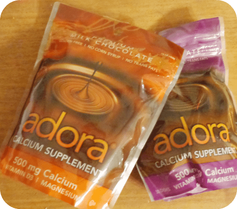 Those concerns about osteoporosis? They are dwindling a bit every day I indulge in my two pieces of chocolate. I’ll take it dark please but you can have the milk chocolate if you prefer. You read right. You can get your calcium with just a little bit of indulgence and no horse sized chalky pills. 2 Adora Calcium supplements (made in the USA by the way) deliver an adult’s daily requirement for calcium – 1000 mg, your daily amount of Vitamin D, and a small dose of magnesium, all at 60 calories, 4 grams of sugar, and gluten-free. They are even safe for kids and are strictly monitored by the FDA. **Processed in a facility that processes tree nuts.