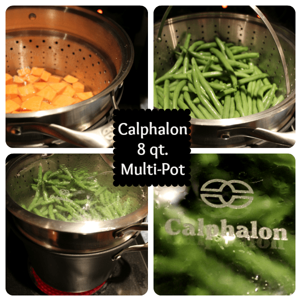 We celebrated a late Thanksgiving/early Christmas with my in-laws this weekend. I’m not sure we can classify it as Thanksgiving Dinner since we didn’t have the classic turkey dinner. We had a delicious slow cooked pork roast, rich and savory, roasted in garlic and onions. Of course I used my favorite slow cooker. Our sides took 2 pans – mashed potatoes, mashed sweet potatoes, and steamed green beans. It was dinner made easy with Calphalon. Calphalon sent me a new Multi-Purpose Pot to try PLUS offered one to give away. Yes! One of you gets to win a Calphalon Contemporary Non-Stick 8 qt. Multi-Pot w/ steamer.