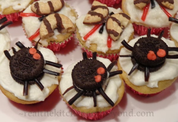The spiders were definitely the most time consuming. I purchased Mini Oreos and Black Licorice Laces. Popped open the Oreo and put 8 tiny pieces of licorice in each one and popped them back together. Then I placed them on the freshly frosted cupcake (make sure you do this right away so they can set up with the frosting and stay in place). Finally, I tinted some frosting a red color and piped tiny eyes on the spiders.