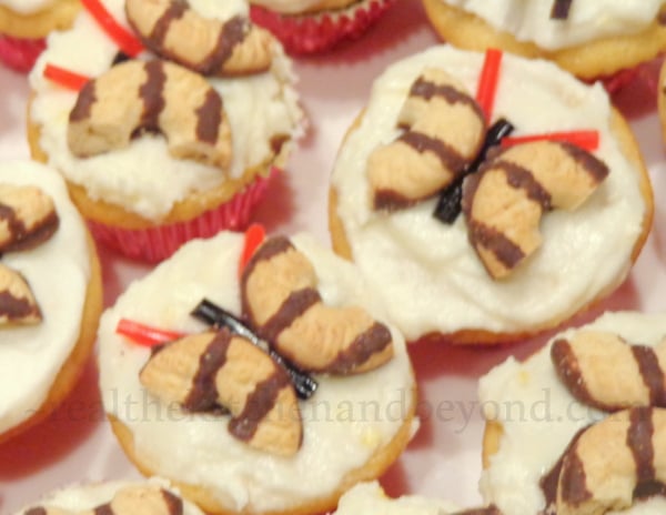 The butterflies were fairly easy once I got the hang of cutting the Mini Fudge Stripes in half. I used Black Licorice Laces for the body, Licorice Laces for the antennae and flipped the little cookie halves around for wings. Instead of placing them upright on the cupcakes and dealing with toppling butterflies I laid the flat on the cupcake. Made no difference to the kids (or adults).
