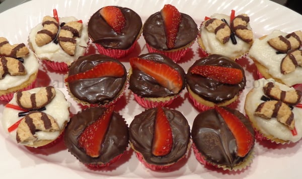 Strawberry lemonade cupcakes topped with butterflies and spiders for a preschool party